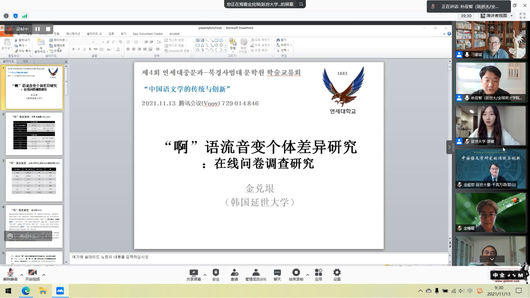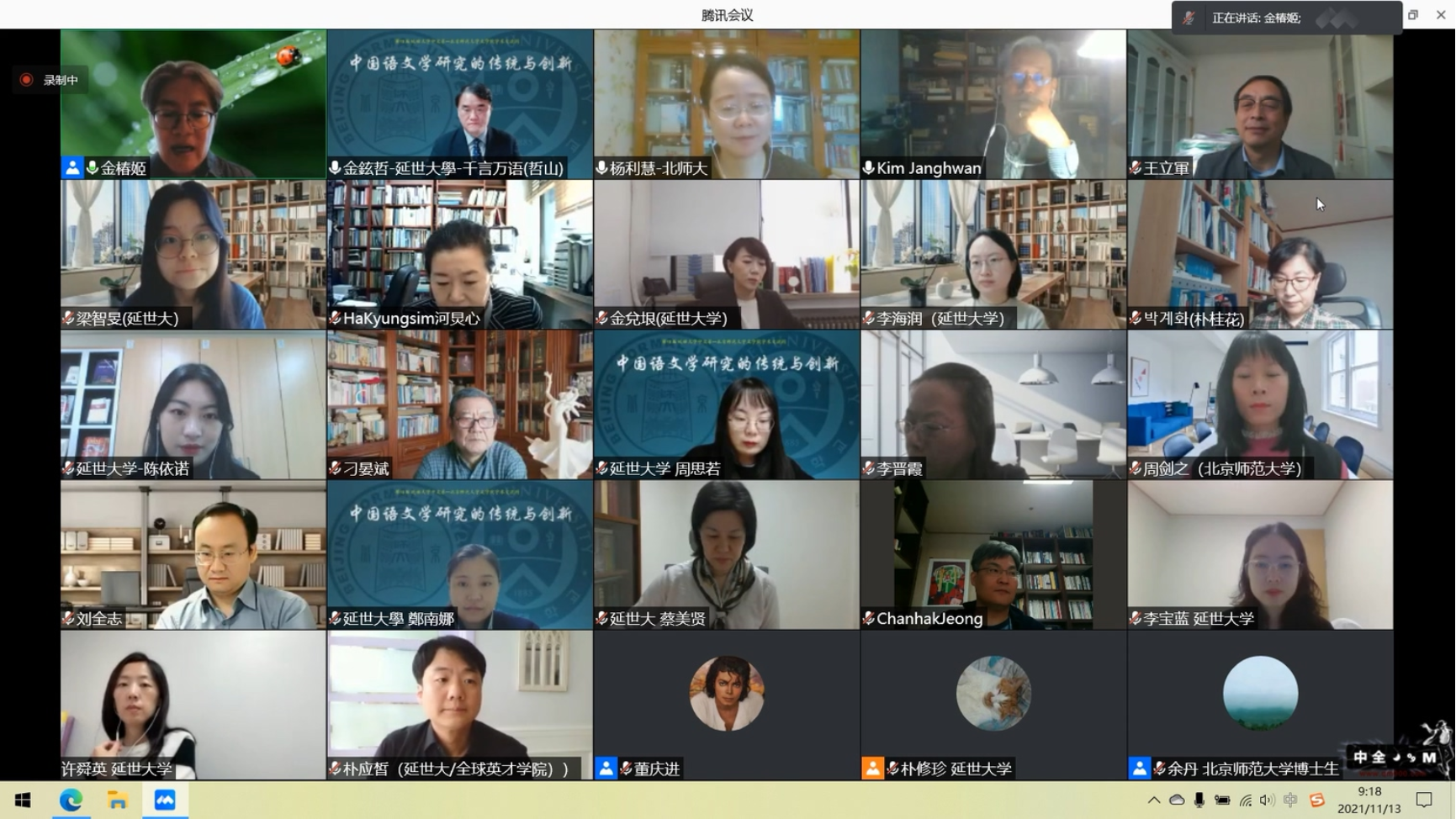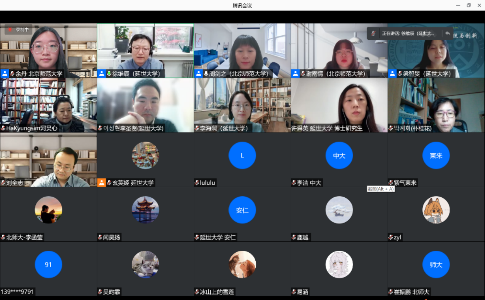 2021年11月13日,“中国语文学研究的传统与创新——第四届韩国延世大学中文系-云顶集团welcome官网学术交流周”在腾讯会议线上成功举行。此次国际论坛由韩国延世大学中文系主办,云顶集团welcome官网与国际文化交流学术联盟-文学专委会共同协办。来自两院系的26位专家学者和博士研究生分为5个会场,针对“语法学”“音韵学”“文学和思想”“古代文学”“神话学”等领域中的前沿学术问题,展开了热烈的交流与讨论。共约400余人次中韩学者和学生参与了本次前沿论坛。 北京时间上午9时,论坛开幕式正式开始,由延世大学金椿姬教授主持,延世大学文学院院长金铉哲教授致欢迎辞,北师大文学院院长、国际文化交流学术联盟理事王立军教授以及延世大学人文学研究院院长金长焕教授分别致辞。延世大学河炅心、朴应皙、金兑垠、金椿姬、徐维辰等教授,我院杨利慧、刁晏斌、李晋霞、周剑之、刘全志等教授和副教授,以及两校近百名专家学者和学生参加了开幕式。 金铉哲院长在欢迎辞中阐述了中国语文学研究的重要意义,并指出中国语文学研究不仅要在某个特定领域进行,而且应当在语言、文学、文化等各个领域,通过相互融合的方式进行深入考察,以此促进该学科在两院及两国的均衡和良性发展。金院长强调了此次会议的重要意义并展望了中国语文学的未来发展前景,最后表达了对双方办会人员以及与会师生的衷心感谢和热烈欢迎,并预祝论坛圆满成功。 王立军院长首先回顾了两院系学术交流周的发展历程。第一届和第二届交流周分别于2018年和2019年在我院和延世大学中文系召开,双方围绕中国语文学的各个议题,通过专题研讨、学者对谈、博士生论坛等多种形式展开了一系列交流活动。2020年由于新冠疫情的爆发,使第三届活动转为线上开展,中韩双方就中文学科的前沿问题开展了热烈的讨论。本次交流周活动继续克服疫情带来的种种不便,成功按时在线召开,彰显出两院系师生的极大热情。王院长指出,今年交流周的主题为“中国语文学研究的传统与创新”,涉及了语言、文学、文化的多个领域,中韩师生将深入交流和研讨双方最新的研究成果。四年来,两院系之间持续开展的交流周活动已经成为北师大文学院的国际化品牌之一,通过交流周,两院系之间加强了相互了解和合作。希望未来双方继续深入交流,并由此深化中韩两国传统友谊。最后,王院长对主办方延世大学中文系以及为本次论坛的顺利召开付出诸多努力的双方师生表示了衷心感谢,并预祝本次学术交流活动圆满成功。 延世大学金长焕院长对本次交流周的召开表示了衷心祝贺,对促成本次活动顺利举办的各位老师同学表示感谢,并指出虽然今年的研讨会不可避免地在线上举行,但是希望明年的活动可以在线下面对面地开展讨论。 开幕式过后,参会的学者和博士生们分为5个专场进行了学术发表和交流。 上午的论坛共有两个专场。首先是语法/音韵学研讨专场。其中延世大学金兑垠教授作了题为“‘啊’语流音变个体差异研究:在线问卷调查研究”的报告,指出“啊”语流音变在教材和实际使用中的变调并不相同,并通过在线问卷调查和详细的数据分析呈现证明了这一点,调查证明,性别、年龄、普通话使用时间、使用者所在方言区等因素都会或多或少地影响“啊”的语流音变。北京师范大学刁晏斌教授作了题为“‘无色’指人名词初探”的报告,认为“无色”指人名词具有表示泛指义、包含强烈的粘着性和对修饰成分有强烈的选择性三个突出特点,并以“人员”等词为例说明了其在高频的使用中的发展变化。延世大学博士生郭敬作了题为“‘看’的可能补语搭配分析——以‘看不X’为中心”的报告,按照“看”的不同义项分类,详尽地考察了各个“看不X”结构中,并用概念整合理论对该结构的整合程度进行了分级。延世大学博士生周思若作了题为“汉语紧缩句宏事件分析”的报告,介绍了国外最新的宏事件理论并用该理论分析汉语紧缩句,并从紧缩句所表示的宏事件类型对紧缩句进行宏观和微观的分类,总结了紧缩句中主事件的五种类型。 “文学和思想研讨专场”由我院古代文学所副所长周剑之副教授主持,发言人包括徐维辰、刘全志、朴桂花、崔振鹏,发言结束后展开了热烈的讨论。徐维辰教授和朴桂花老师表示北师大师生的发言都十分精彩,希望以后继续多多学习。我院刘全志副教授表示徐维辰教授的论文把握住了清末民初历史小说到科学小说的转变,与当时的社会现实密切相关;朴桂花老师的论文论述促织故事的创新,文本涉及诗、词、笔记、小说等各类文体。徐维辰回应科学和科幻小说的区别在于科学小说相信其中描绘的东西不是一种幻想,在未来能够实现。朴桂花回应今后将寻找更多蟋蟀和促织的相关文献。在评议环节,周剑之认为徐教授抓住了小说模式的转变以及其间所贯通的批判现实精神;朴老师对促织故事的梳理全面细致,分析了蒲松龄对传统的吸收和创造,并且由此联想到中国古代的离魂故事;肯定了刘老师对于“解祠”的论述,是民俗、文化、制度的综合性研究;认为崔振鹏的论文从春秋学的角度揭示了杨维桢乐府诗的成就。在提问环节,延世大学金长焕教授向刘老师提问“枭”与“鸱鸮”之间的区别,以及中国现在是否还有食“枭羹”的习俗,刘