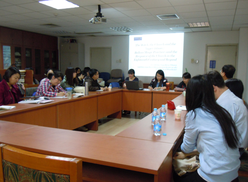 阿德林娜•阿古谢娃-提汉诺夫(Adelina Angusheva-Tihanov)博士曾在美国俄亥俄州立大学、加拿大多伦多大学和英国爱丁堡大学、兰卡斯特大学等任教与从事研究,现任英国曼彻斯特大学艺术语言文化学院俄罗斯与东欧研究系研究员。她的主要研究领域有:中世纪保加利亚文学、中世纪医术、性别、巫术、巴尔干民间文化与民间信仰。讲座开始后,阿古谢娃研究员从古典时期谈起,详细介绍了巫术与女巫的起源与发展,特别是十五世纪以来西欧的女巫恐慌和女巫迫害,并对比了东欧巴尔干地区对于巫术及女巫的不同态度。根据十八世纪教会权威、十九和二十世纪历史学家和民俗学家的记述,阿古谢娃勾勒了巴尔干女巫活动的社会历史图景。结合丰富的文献资料与她细致的田野作业经验,阿古谢娃研究员在讲座中使用了大量的图片,用生动形象的语言为我们呈现巫术与东西欧教会的复杂关系。